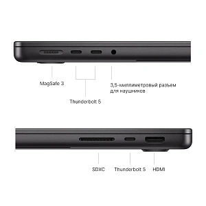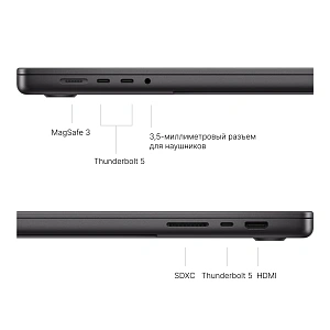 MacBook Pro на чипе M3 Pro предлагает множество портов для подключения, включая три порта USB-C 4.0 с поддержкой Thunderbolt 4, HDMI, порт для зарядки MagSafe 3, слот для карт памяти SDXC и аудиовыход 3,5 мм. HDMI возрос до стандарта 2.1 — поддерживаются мониторы и телевизоры с разрешением до 8K и частотой до 120 Гц. MacBook также поддерживает сверхбыстрый Wi-Fi 6E и Bluetooth 5.3 – настоящий удобный инструмент для подключения различных устройств и аксессуаров.